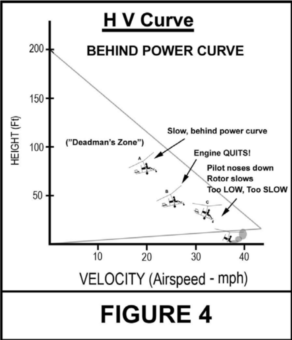 If you are flying low, close to the ground, under the lower “ledge” of the H/V curve, you probably can make a safe landing – with adequate proficiency!
