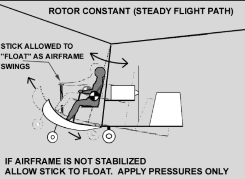 However, even on gyros where the airframe is not stabilized and is able to swing or deflect readily, good pilot proficiency through training and experience may overcome the inherent instabilities. Most of the undesirable coupling from airframe into the rotor system occurs because of pilot stick control inputs - either not allowing the stick to move or inputting improper stick movements or pressures. If the pilot allows the stick to move freely as the airframe swings, there is little undesirable cyclic input into the rotor disk. That means that the pilot should apply only force pressures on the stick, not stick restriction or movements. Only the pressure on the stick should be applied to provide commanded cyclic control input to the rotor.